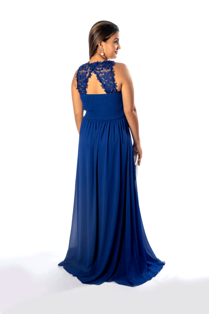 Vestido confeccionado en gasa, color Azul con caída y Top de encaje