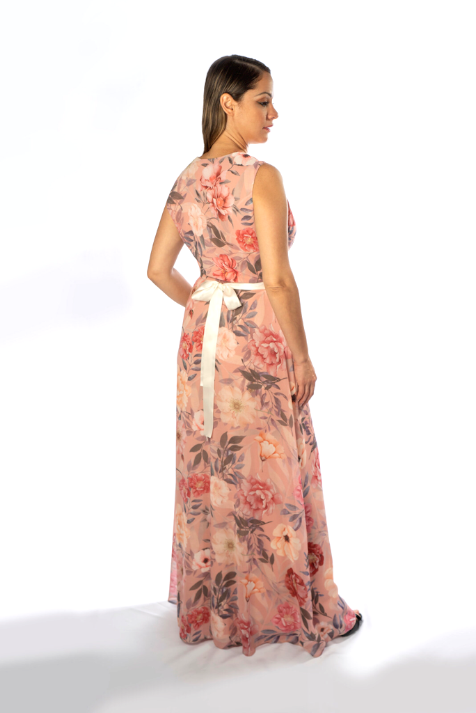 Vestido confeccionado en tul gasa estampada con cinturón de raso y prendedor de flor en color Blanco.